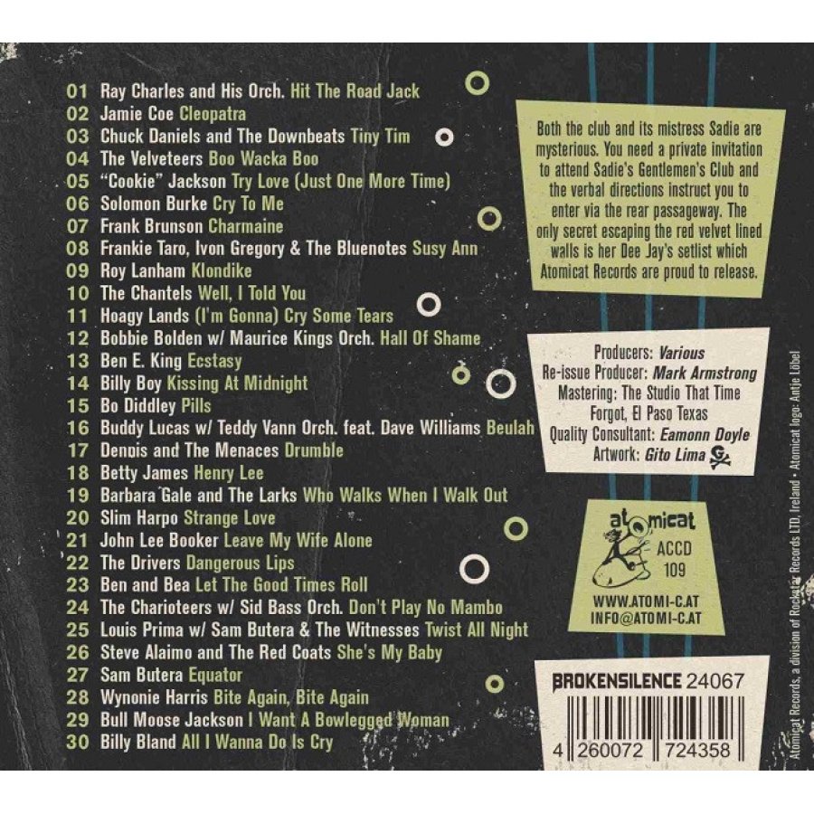 01 Ray Charles and His Orchestra Hit The Road Jack (Mayfield) ABC-Paramount 1961 02 Jamie Coe Cleopatra (Pomus, Shuman) Bigtop 1962 03 Chuck Daniels and The Downbeats Tiny Tim (Baker, Bradford) Audio 1961 04 The Velveteers Boo Wacka Boo (Calloway, Lyrois) Spitfire 1956 05 “Cookie” Jackson Try Love (Just One More Time) (Chambers) Cyclone 1961 06 Solomon Burke Cry To Me (Russell) Atlantic 1961 07 Frank Brunson Charmaine (Rapee, Pollack) Groove 1956 08 Frankie Taro, Ivon Gregory and The Bluenotes ?Susy Ann (Carone, Ciaramitaro) G & G 1958 09 Roy Lanham ?Klondike (Lahman) Radio Record Co. 1958 10 The Chantels Well, I Told You (Barrett) Carlton 1961 11 Hoagy Lands (I'm Gonna) Cry Some Tears (Russell, Medley) ABC-Paramount 1960 12 Bobbie Bolden with Maurice Kings Orchestra Hall Of Shame (Schalitz, King, Abrass) Terel 1959 13 Ben E. King Ecstasy (Pomus, Spector) ATCO 1962 14 Billy Boy Kissing At Midnight (Arnold, Thompson) Vee Jay 1957 15 Bo Diddley Pills (McDaniels) Checker 1962 16 Buddy Lucas with Teddy Vann Orchestra featuring Dave Williams Beulah (Lucas) Carlton 1959 17 Dennis and The Menaces Drumble (Holland, Wilson) Dot 1960 18 Betty James Henry Lee (James) Chess 1962 19 Barbara Gale and The Larks Who Walks When I Walk Out (Goodhardt, Hoffman, Freed) Lloyds 1954 20 Slim Harpo Strange Love (Moore, West) Excello 1958 21 John Lee Booker Leave My Wife Alone (Collier) Chess 1951 22 The Drivers Dangerous Lips (Price) DeLuxe 1957 23 Ben and Bea Let The Good Times Roll (Lee) Philips 1962 24 The Charioteers with Sid Bass Orchestra Don't Play No Mambo (Stryker) Josie 1955 25 Louis Prima with Sam Butera and The Witnesses Twist All Night (Prima, Butera) Capitol 1962 26 Steve Alaimo and The Red Coats She's My Baby (Alaimo) Marlin 1959 27 Sam Butera Equator (Stanley) Prep 1957 28 Wynonie Harris Bite Again, Bite Again (Harris) King 1947 29 Bull Moose Jackson and His Buffalo Bearcats ? I Want A Bowlegged Woman (Nix, Glover) King 1947 30 Billy Bland All I Wanna Do Is Cry (Battaglia, Brandon) Old Town 1961